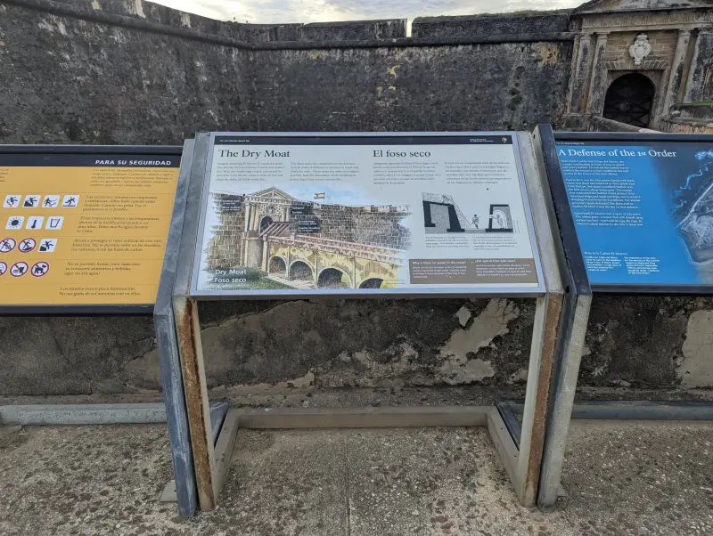 Foso: Excavación alrededor de la fortaleza diseñada para dificultar ataques directos a los muros. En El Morro, funcionó como barrera seca frente a la infantería enemiga.