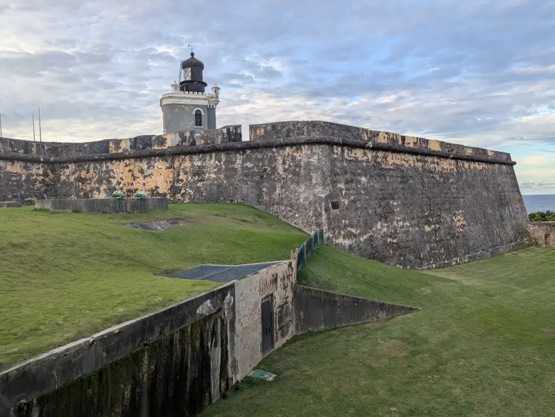 En la parte alta está el faro, que aunque es más reciente (de la época estadounidense), se integra bien. Desde ahí se ve el océano abierto, y del otro lado, el Viejo San Juan. Esa dualidad —el mar por un lado y la ciudad por el otro— resume bastante bien el papel del castillo: defender el puerto, pero también vigilar la vida cotidiana que crecía a su sombra.