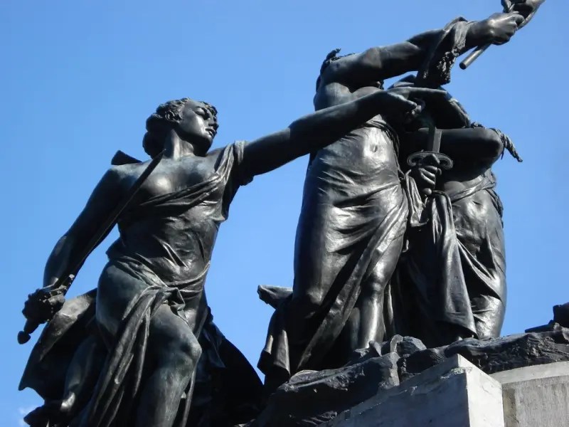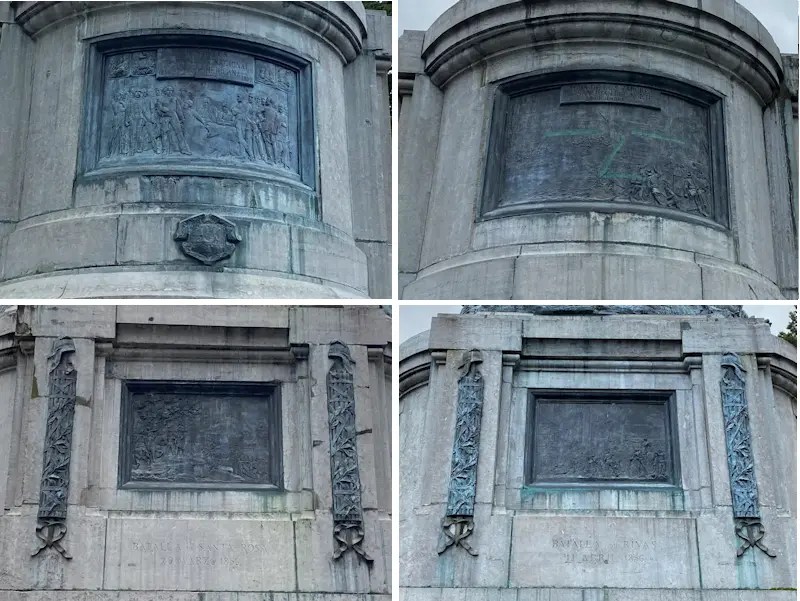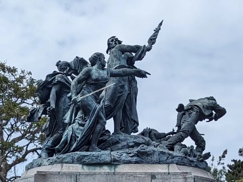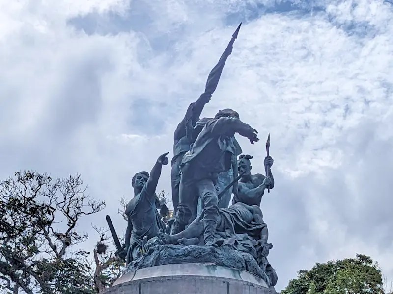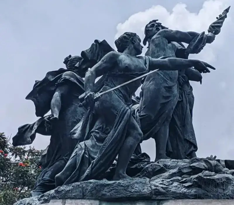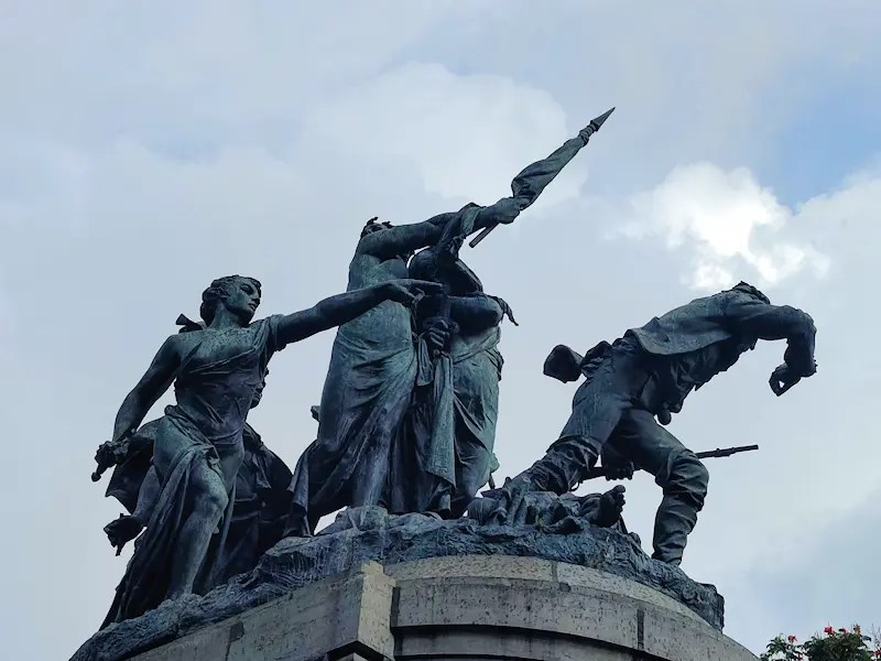 Además, adornan el pedestal, escudos y fasces, que simbolizan la justicia. Como ya mencioné, el Monumento Nacional se terminó en París en 1891 y, por lo tanto, lleva la siguiente inscripción: “Louis Carrier Belleuse, 1891”.