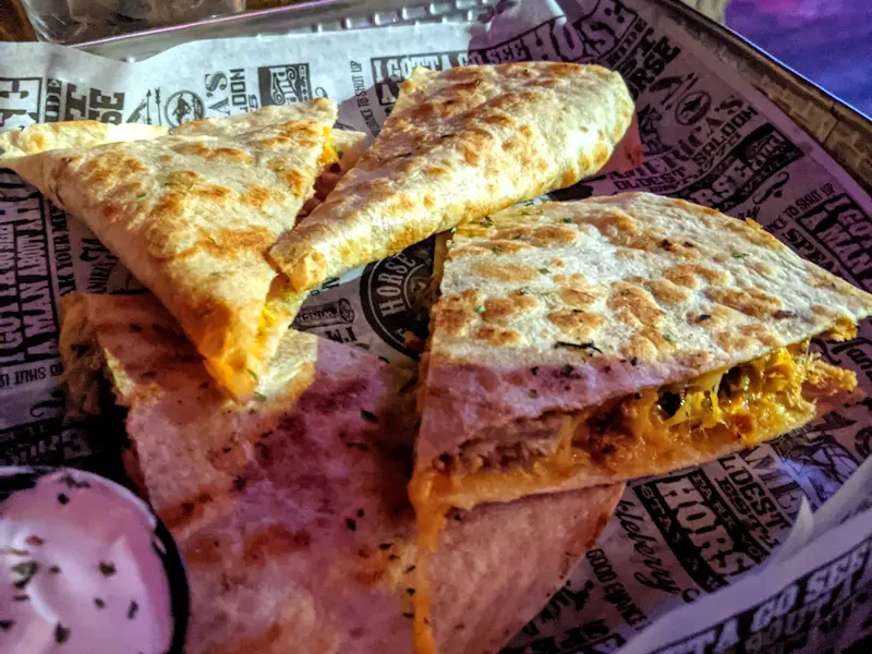 En una patrulla seria no se puede beber con el estómago vacío, y The Horse ofrece una cocina que, sin pretensiones, calienta el alma. Aquí no hay lujos, sino clásicos que reconfortan. The «Horse» Nachos son una montaña de nachos de la casa cargados de queso, chili y jalapeños, siendo el plato local por excelencia. La Wild West Burger es el verdadero plato estrella; es una hamburguesa bañada en una reducción de whisky Jack Daniel’s que parece un homenaje líquido a la barra que nos rodea con tocino ahumado, lechuga, tomate, cebolla crujiente, queso americano y jalapeños. El dulzor ahumado del whisky en la salsa es el puente perfecto entre la cocina y la destilería. Cowboy fries son papas fritas ralladas con tocino ahumado, jalapeños y queso mexicano fundido, servidas con salsa ranchera y con una lluvia generosa de Old Bay, ese polvo anaranjado y especiado, recordatorio constante de que estamos en el corazón del Chesapeake. Mozzarella Sticks y Chicken Tenders son los sospechosos de siempre en cualquier taberna de Estados Unidos, fritos a la perfección para equilibrar la intensidad de un Jack Daniel’s en las rocas. Las quesadilas vienen con queso mexicano fundido con cebolla, pimientos y jalapeños que pueden ser de queso, pollo, costilla o carne com fueron las que ordenamos. Los tacos gringos vienen con queso mexicano fundido con cebolla, pimientos y jalapeños que como las quesadillas pueden ser de queso, pollo, costilla o carne, como en nuestro caso y con una porción de arroz blanco que se agradece.