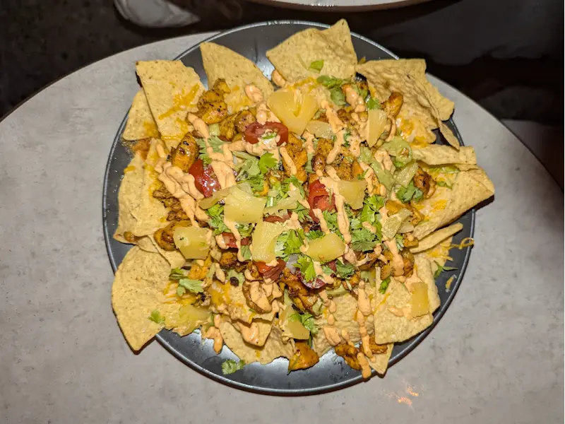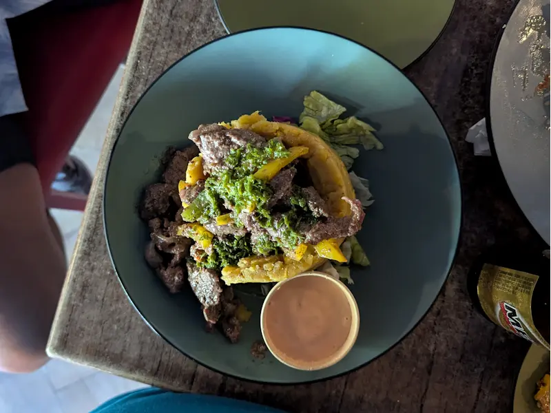 Aquí buscamos algo más sustancioso. Nos decidimos por unos nachos mixtos grandes, para que todos pudiéramos comer, y un mofongo relleno de carne frita. La textura del plátano majado con el toque de ajo fue el cierre de oro para esta patrulla. Para beber, nos dejamos aconsejar por el bartender y terminamos con un cóctel a base de ron añejo, cerrando la noche con el calor del espíritu boricua.