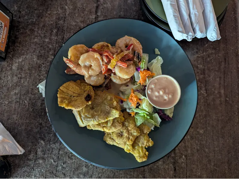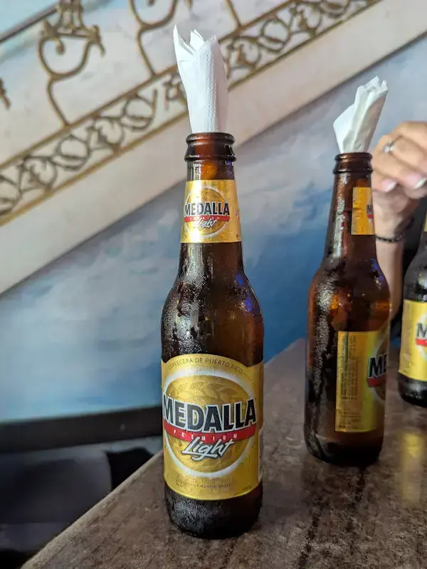 Aquí nos fuimos directo a lo clásico de y pedimos un mofongo, comida típica de la isla. Pedimos unas alcapurrias de carne y unos bacalaítos que estaban en su punto exacto de tostado. La grasa justa para que la Cerveza Medalla (la compañera inseparable de esta patrulla en la isla) cumpliera su función refrescante. También ordenamos unos tostones, que es como llaman a los patacones por esos lares, que se pueden ordenar con carne o camarones.