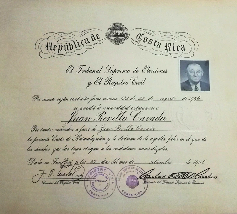 Juan Revilla Cavada nació en 1891 en España. Llegó joven a Costa Rica, donde se casó con María Emilia Clotilde (Tila) Meléndez Lizano el 1ero de enero de 1924, en Heredia. Tuvieron cuatro hijos, y en los registros de ese mismo año aparece como comerciante en esa ciudad. Años después, el 23 de agosto de 1956, obtuvo su carta de naturalización costarricense, un documento que hoy guardamos con orgullo como símbolo del arraigo definitivo de nuestra familia en esta tierra. De hecho, siempre se contó en la familia que se conocieron en alguno de los viajes en que mi abuelo conducía el camión en la ruta Heredia–San José y mi abuela era pasajera.