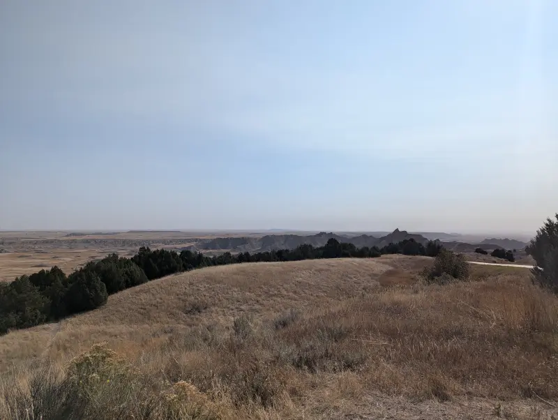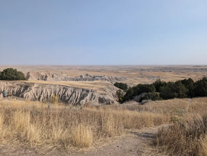 Lo primero que me sorprendió no fueron las formaciones rocosas, sino el silencio. Un silencio que no es vacío, sino antiguo. De esos que hacen que uno hable más bajo sin saber por qué. A lo lejos, un grupo de bisontes avanzaba con la calma de quien sabe que no tiene prisa. Cerca del sendero, los perros de la pradera entraban y salían de sus túneles como vigilantes nerviosos. Y más allá, las montañas de arcilla se iban difuminando en capas rosadas, amarillas y grises, como si alguien hubiese dejado una acuarela al sol. También hay que destacar el fuerte viento, de esos que casi lo vuelcan a uno. Fue especialmente notorio en el mirador principal donde nos detuvimos a admirar el paisaje.