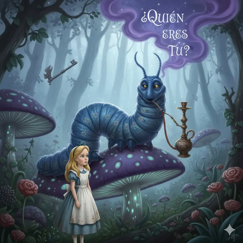 Representada en su estado de absoluta indiferencia filosófica. La ilustración captura la densa atmósfera de humo y la mirada inquisitiva que precede a su famosa pregunta: «¿Quién eres tú?». Se buscó un realismo que resaltara la textura quitinosa en contraste con la suavidad del hongo.