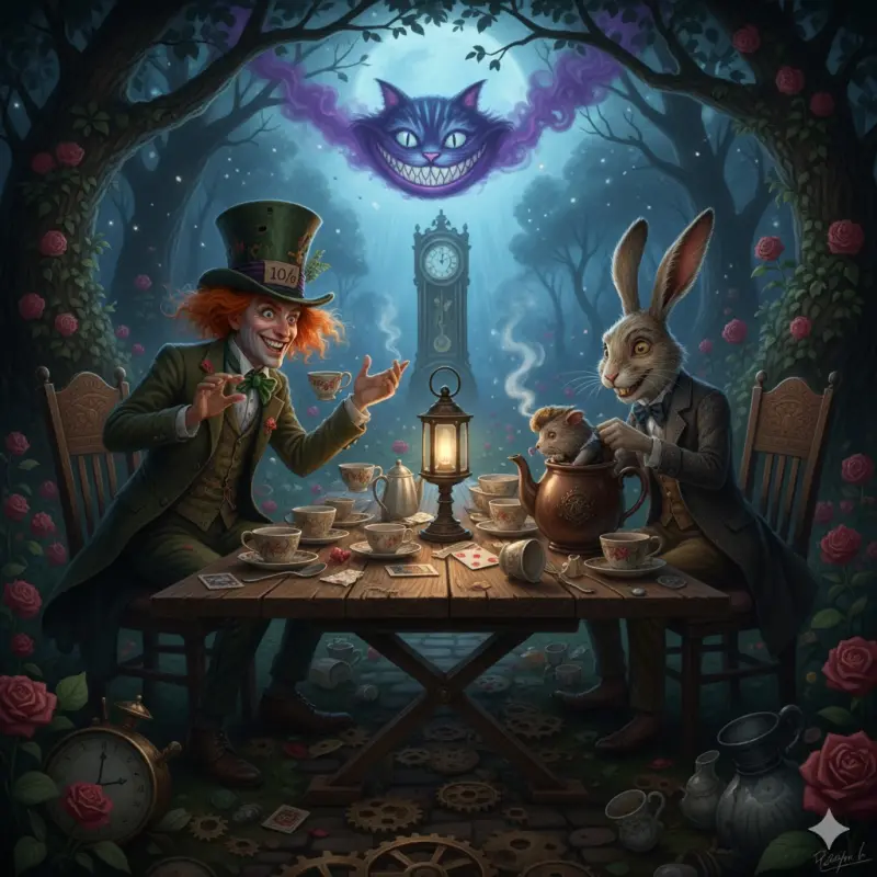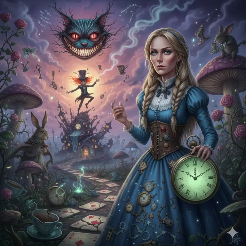 El ejercicio consistió en recrear los personajes de Alicia en el país de las maravillas bajo una estética de fantasía oscura y gran detalle. Sin embargo, lo que empezó como un simple experimento visual terminó convirtiéndose en una reflexión sobre la naturaleza de la creación y esa característica tan humana —y tan propia de Charles Dodgson— que solo podemos definir con una palabra: la tequiosidad.