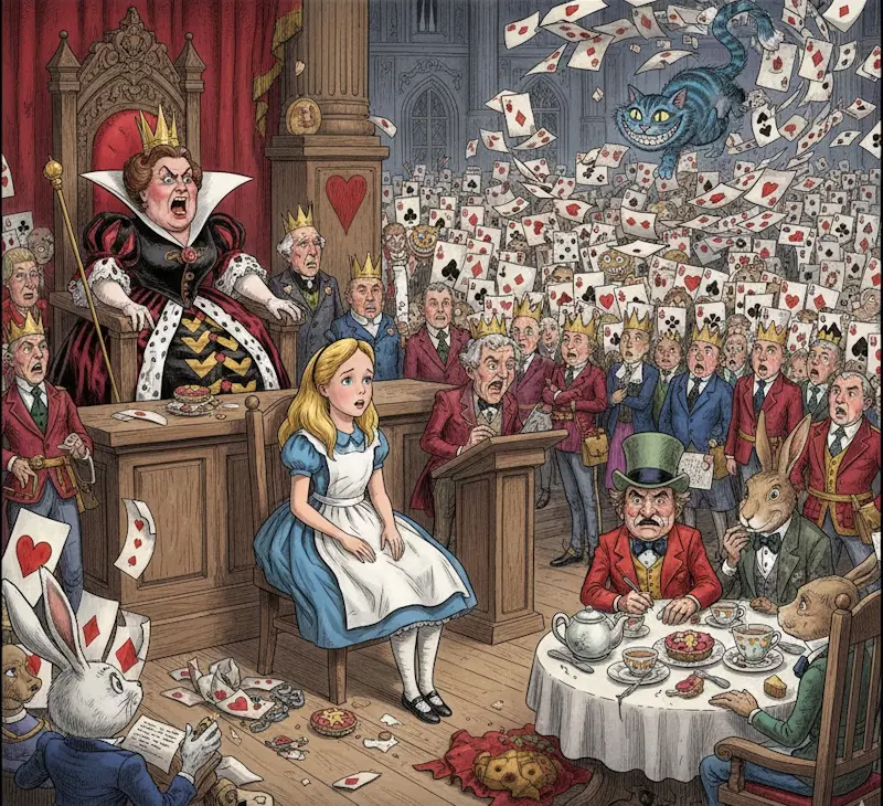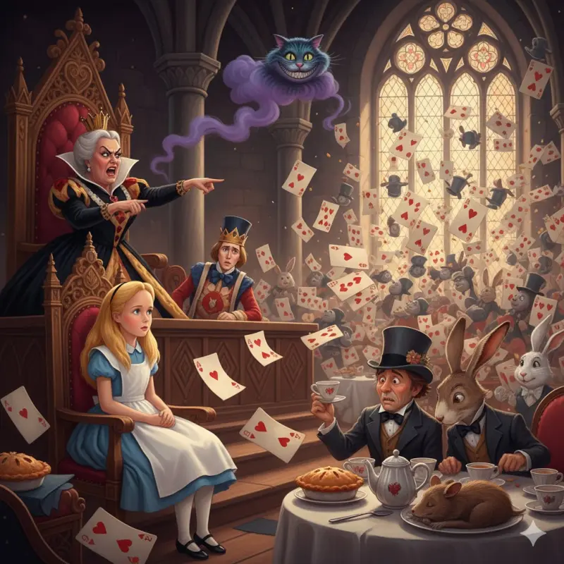 La Reina de Corazones: La implacable monarca que juega croquet con flamencos y erizos. Su única política es la ejecución.