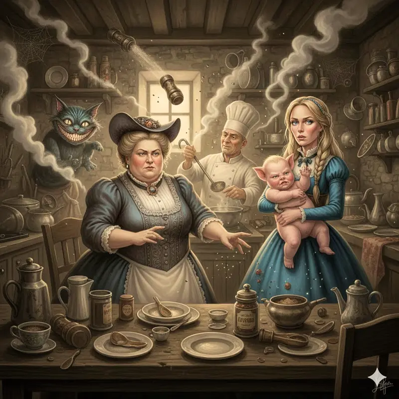 Una de las escenas más grotescas y caóticas del libro. El desafío aquí fue equilibrar la fealdad cómica del personaje con la atmósfera cargada de pimienta de su cocina. La metamorfosis inminente del bebé se insinúa en sus rasgos, capturando el surrealismo oscuro de la obra.