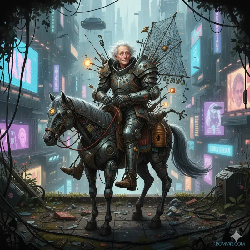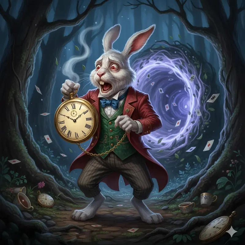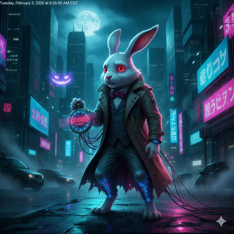 Nuestra pieza de cierre. El heraldo del País de las Maravillas, reinterpretado bajo una estética cyberpunk que une la obsesión de Dodgson por el tiempo con la visión tecnológica de Philip K. Dick. Sus ojos rojos y su reloj digital son el puente definitivo entre dos siglos.