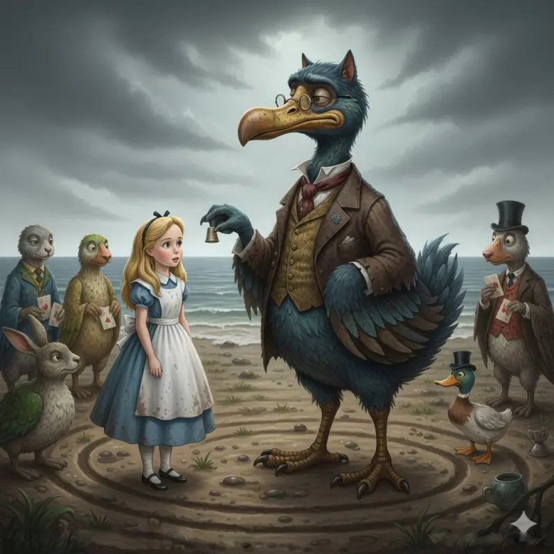 El ratón y las aves: Los personajes que Alicia encuentra al principio en el «Charco de Lágrimas», incluyendo al Dodo, que organiza la Carrera en Comité donde todos ganan.