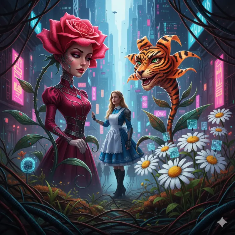 Al enfrentar a la IA a este desafío, me encontré con un “colaborador” que, aunque capaz de generar imágenes asombrosas en segundos, padece de una curiosa “ansiedad” algorítmica. En un punto de la charla, el sistema se bloqueó por un exceso de celo: sus filtros de seguridad confundieron el surrealismo carrolliano con algo perturbador. Es aquí donde la tecnología se encuentra con Philip K. Dick, ese gena escritor de ciencia ficción.