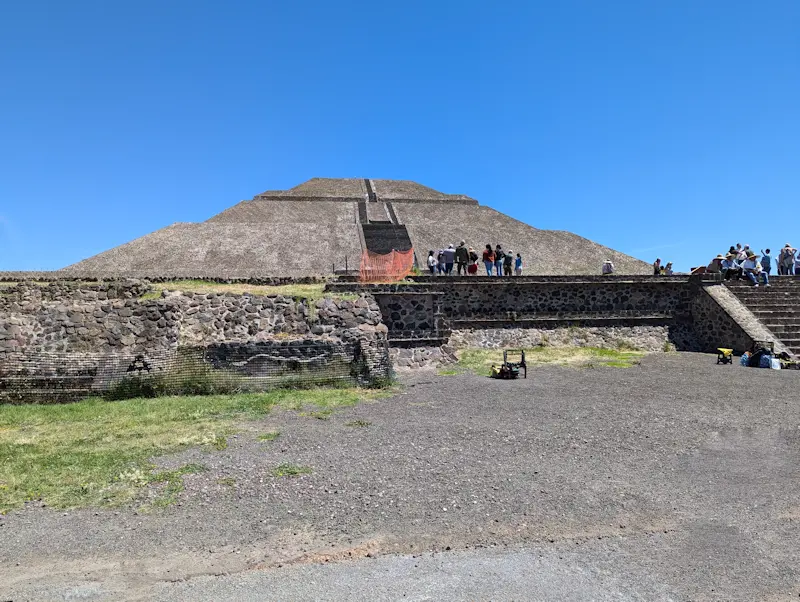 La pirámide de la Luna: Ubicada al norte de la ciudad, al final de la Calzada de los Muertos, era un centro ceremonial clave. Aunque más pequeña que la del Sol, es igualmente impresionante. Su construcción empezó un poco antes, posiblemente entre los años 100 y 200 d.C., y sufrió varias ampliaciones. Está estrechamente vinculada al Cerro Gordo, la montaña que se alza detrás de ella, lo cual sugiere una conexión simbólica entre el paisaje natural y la arquitectura sagrada. En su interior, se han hallado entierros ceremoniales con ofrendas de animales, humanos y objetos preciosos, indicando su importancia en rituales religiosos dedicados a deidades de la fertilidad, la guerra y la muerte.