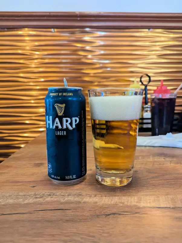 Hay una gran selección de cervezas e barril, artesanales locales, cócteles —por ejemplo un Old Fashioned muy bien valorado—, y bebidas irlandesas. Como estábamos en una pub irlandés, así que le pedimos a la mesera que nos recomendara una cerveza lager (clara) y sin dudarlo nos trajo una cerveza Harp de la propia Irlanda.